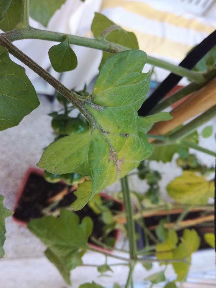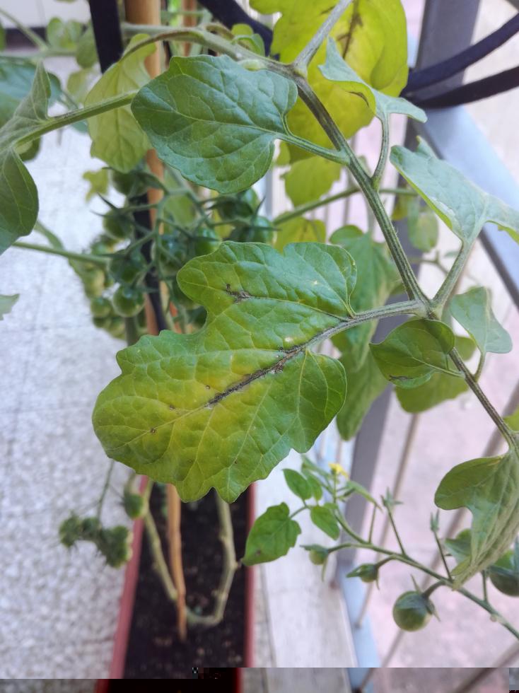 ciao a tutti volevo un consiglio, è già da qualche giorno che le foglie dei pomodori stanno assumendo una colorazione un pò strana e stanno spuntando dei segni scuri...i pomodorini sono già spuntati ma sono ancora verdi ma è come se la crescita si fosse rallentata...vi allego qualche foto così magari qualcuno può darmi qualche consiglio o indicazione premettendo che qui in questi giorni ha fatto molto caldo ma innaffio ogni sera abbondantemente. grazie