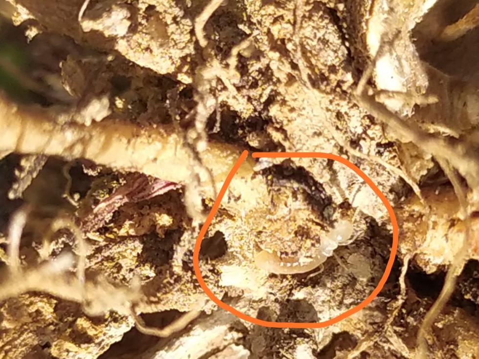 Il Manuale del Pollini su radici riporta solo gli elateridi che nel tuo caso sicuramente sono da escludere (ci sarebbe anche una larva di coccinellide fitofago, ma non viene data come significativamente dannosa). Dunque quello che hai fotografato potrebbe anche non essere in relazione con i danni.