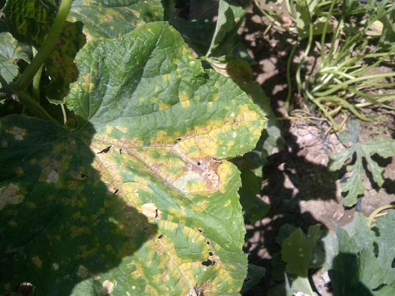 Salve a tutti, da qualche giorno ho notato che i cetrioli cominciano ad avere le foglie a chiazze. Allego foto esplicativa. Chiedo consigli sul da farsi. Sapete dirmi se devo preoccuparmi per le colture vicine? (Melanzane, Zucchine, Pomodori)