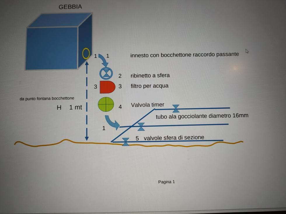 non avendo a disposizione delle immagini di come la gebbia sia posta alla base, ovvero se esiste un dislivello tra la base gebbia e il suolo di coltivazione ti fornisco degli schemi di teoria. Esistono delle elettrovalvole a batteria 9Volt che arpono con una pressione sotto i 0.5 bar ma per avere 0.5 bar occorre che il bocchettone che tu chiami fontana di uscita sia ad una differenza di livello dal suolo orto almeno di 0.70 cm. Se non esiste questo dislivello l'elettrovalvola non potrà aprirsi. nel caso che stai utilizzando adesso metodo con tubo a mano, anche se la bocchetta fontana è a livello terra l'acqua scorre per pressione atmosferica all'altezza del suo massimo livello nella gebbia. Per ottenere un funzionamento automatico occorre che ci sia differenza di altezza tra suolo e l'uscita acqua dalla gebbia di almeno 0.70cm. se non esiste questa situazione dovrai acquistare dei serbatoi e metterli sopra una struttura idonea al peso per elevare in altezza il livello dell'acqua e sfruttare una pressione necessaria alla elettrovalvola timer che regolata secondo bisogno ti consentirà il regolare flusso nei tubi alagocciolante. devi specificare all'acquisto dell'ala gocciolante a bassa pressione. ti allego un esempio sintesi di costruzione dell'impianto. download/file.php?mode=view&id=176068