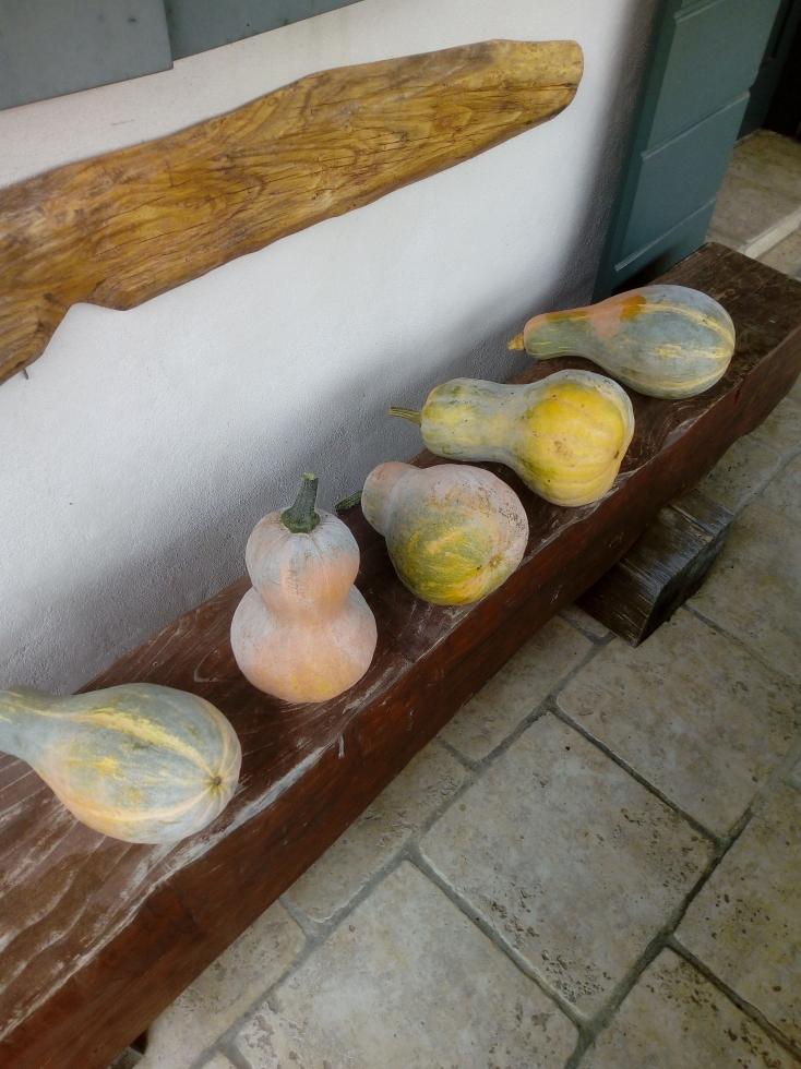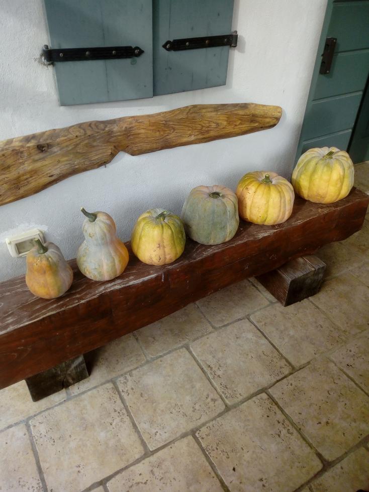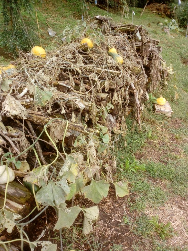 Oggi ho raccolto buona parte delle zucche perché: mature abbastanza, freddo che incombe, si trovavano fuori recinzione....non si sa mai... Adesso ne ho 11 in casa a finire la maturazione. 10-12 sulle piante perché sono minori di grandezza e posso correre il rischio... Allego foto di quelle raccolte e di quelle lasciate. Non so...come al solito....il tipo di zucche