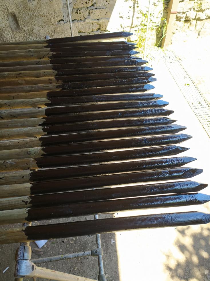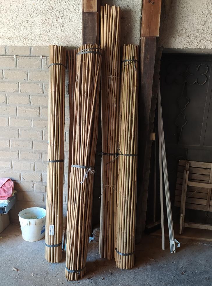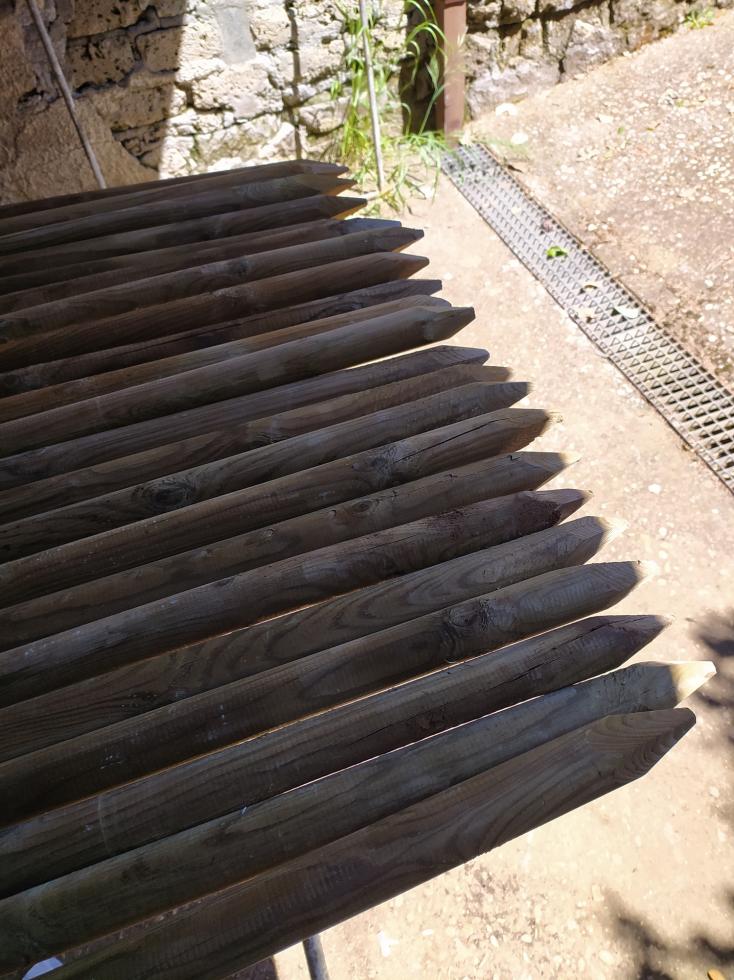 paletti di abete misura cm 4 x 250. sono gia impregnati con l'antimuffa, ma poiché vorrei tenerli per qualche tempo in più, ho dato due mani di catramina per la lunghezza prevista all'innesto al suolo. il foro lo farò con una trivella da cm 4,5 x cm 42. ho fatto una abbondante approvvigionamento di 250 canne bambò da mt 2,10 e 2,50 Prossimamente vedremo insieme a cosa serviranno.