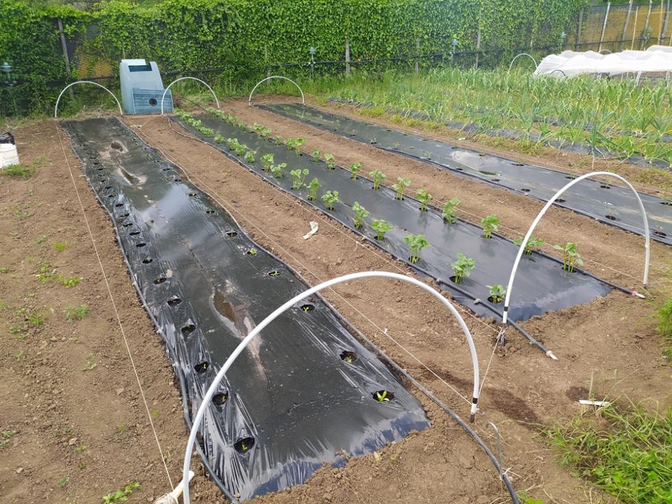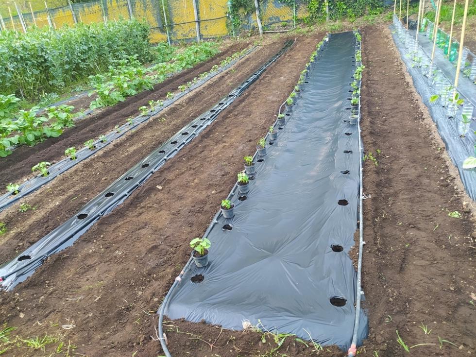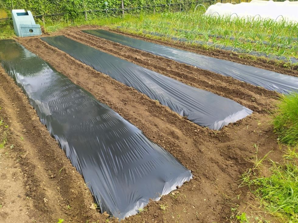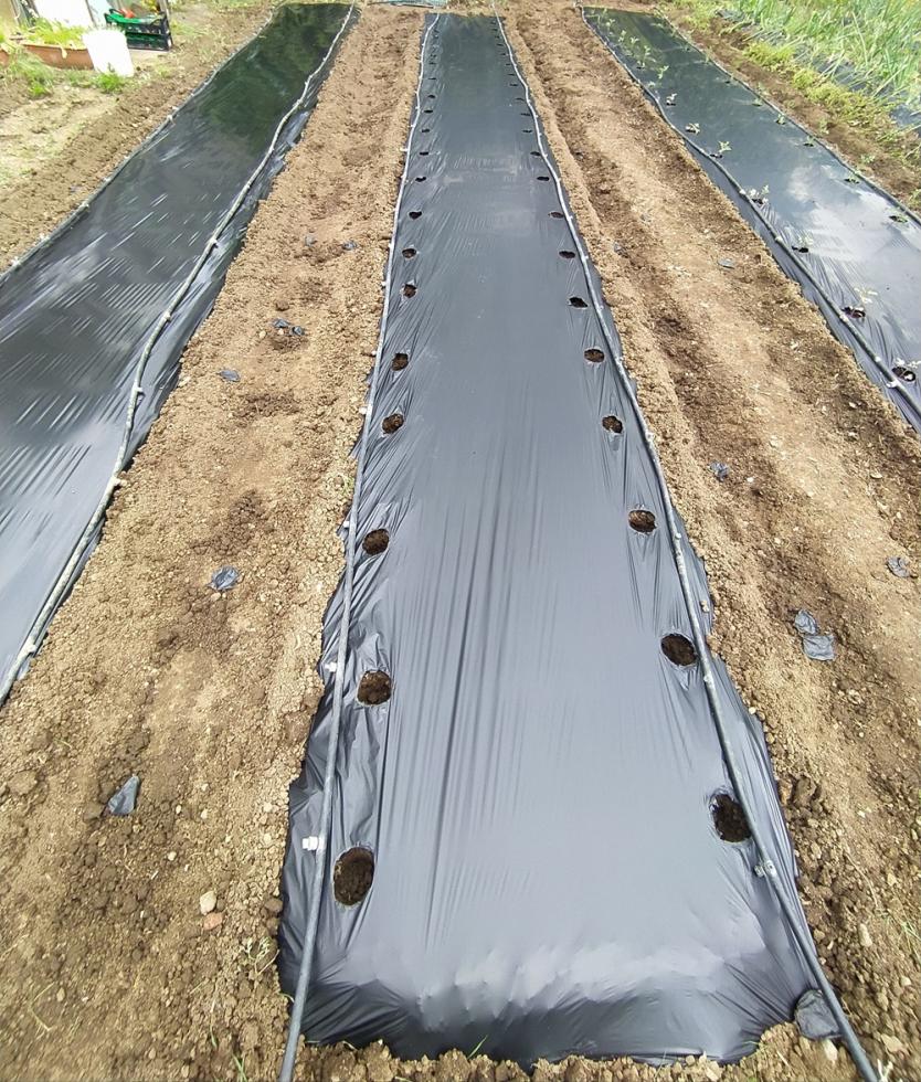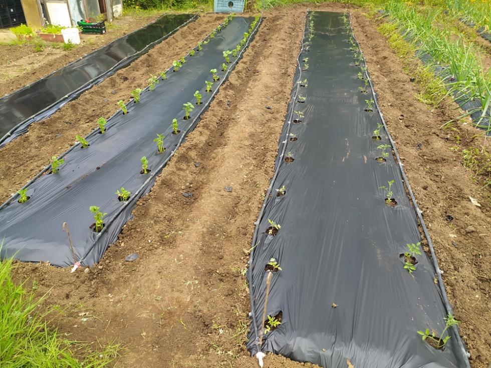 Nel pomeriggio di venerdì ho fresato arieggiato in superficie la terra e sabato ho iniziato con gli allestimenti delle prode con telo nero per completare i trapianti con le restanti piantine che erano in serra.