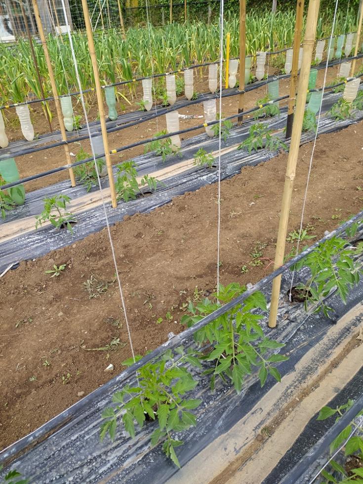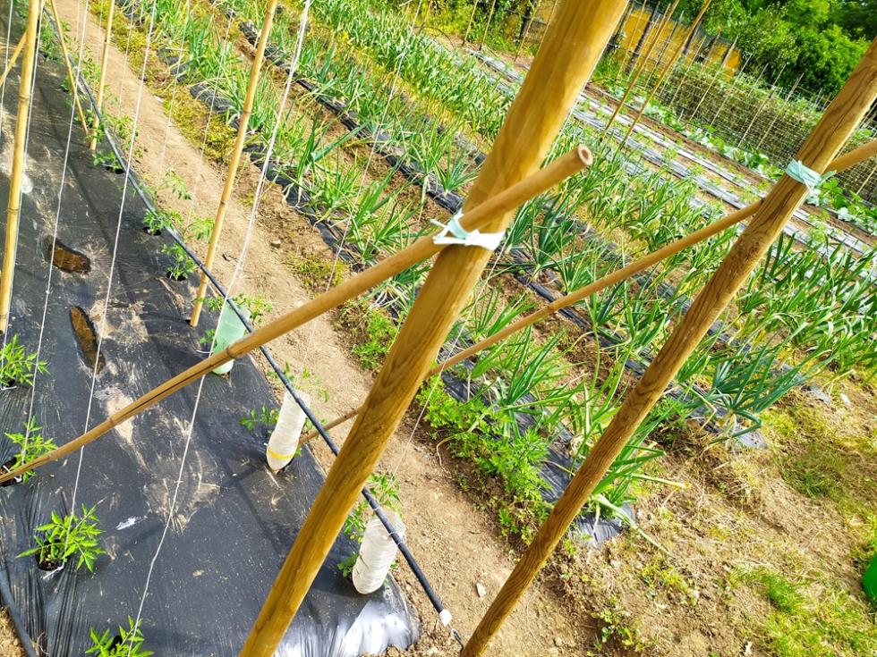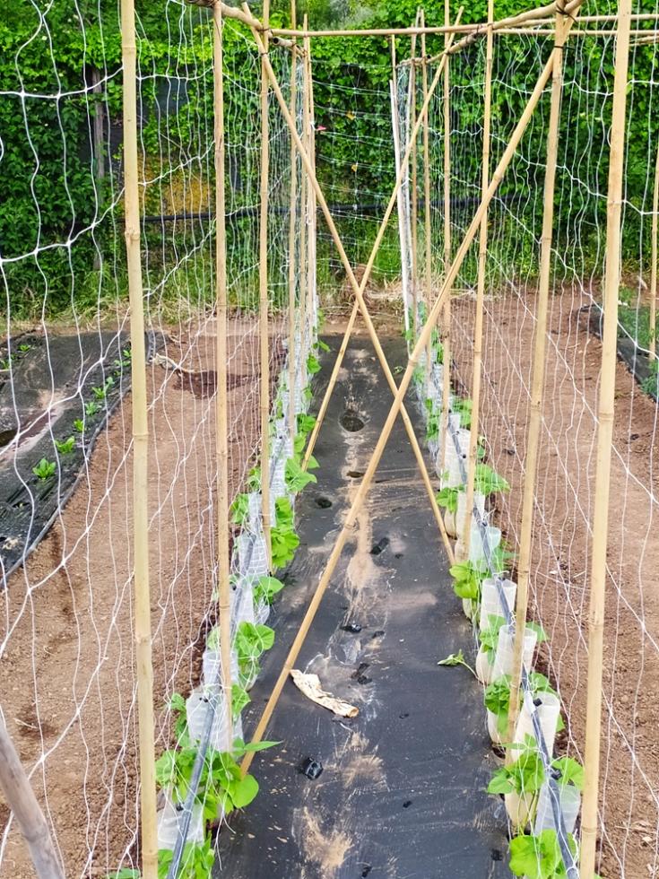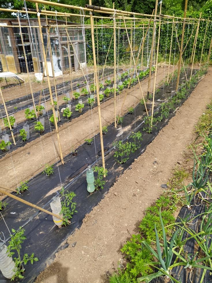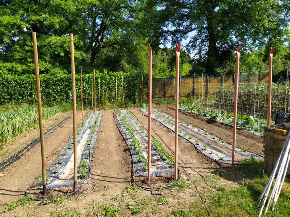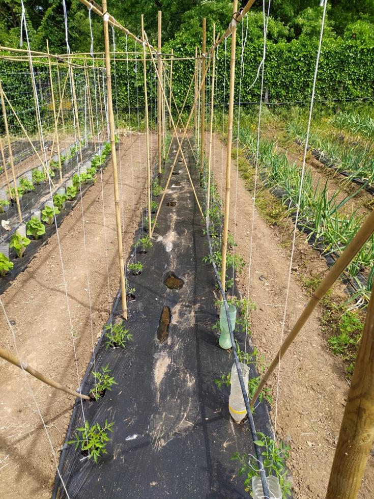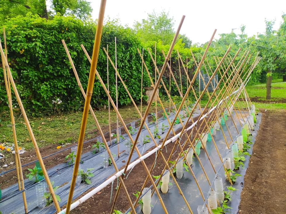 con il ritorno alle normali temperature di periodo, inizia lo smontaggio delle protezioni TNT e mi organizzo per il montaggio totale delle strutture TUTORI. occorre del tempo per il montaggio, circa una settimana. il risultato di questa procedura di montaggio tutori è il risparmio di tempo da dedicare alle piante/crescita e alle irrigazioni che sono tutte assicurate e ben fissate, nel mio caso tutto funzionerà in automatico secondo timer prestabiliti.