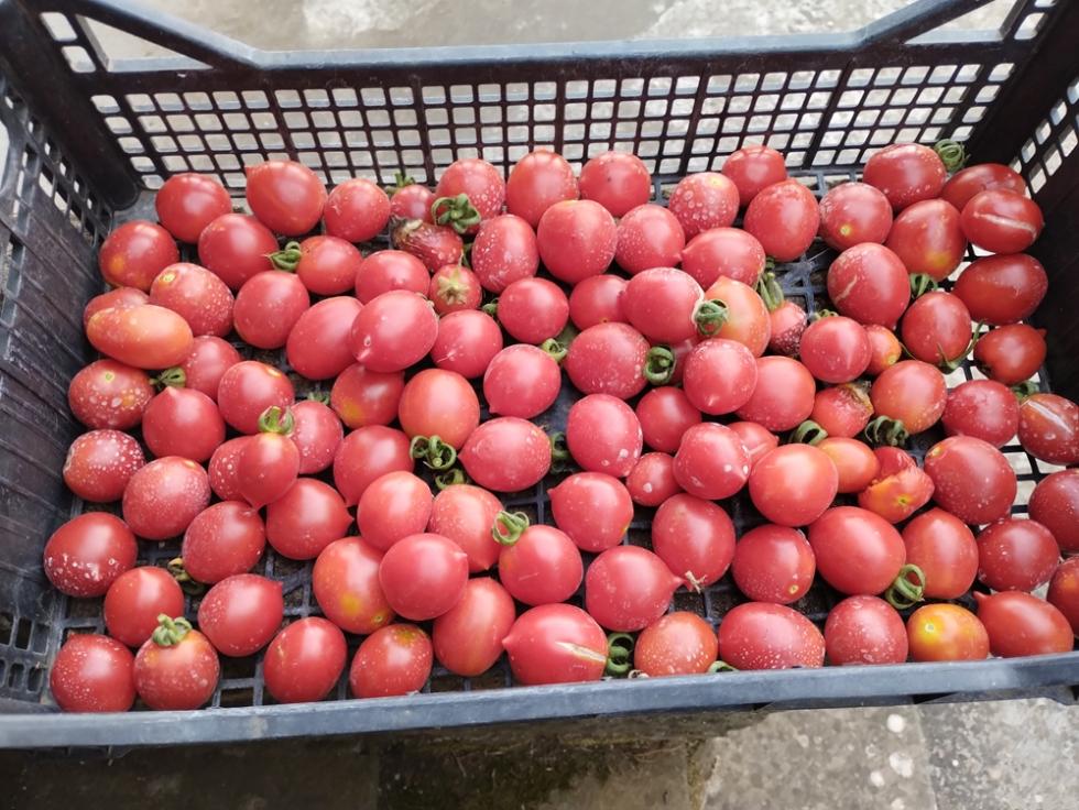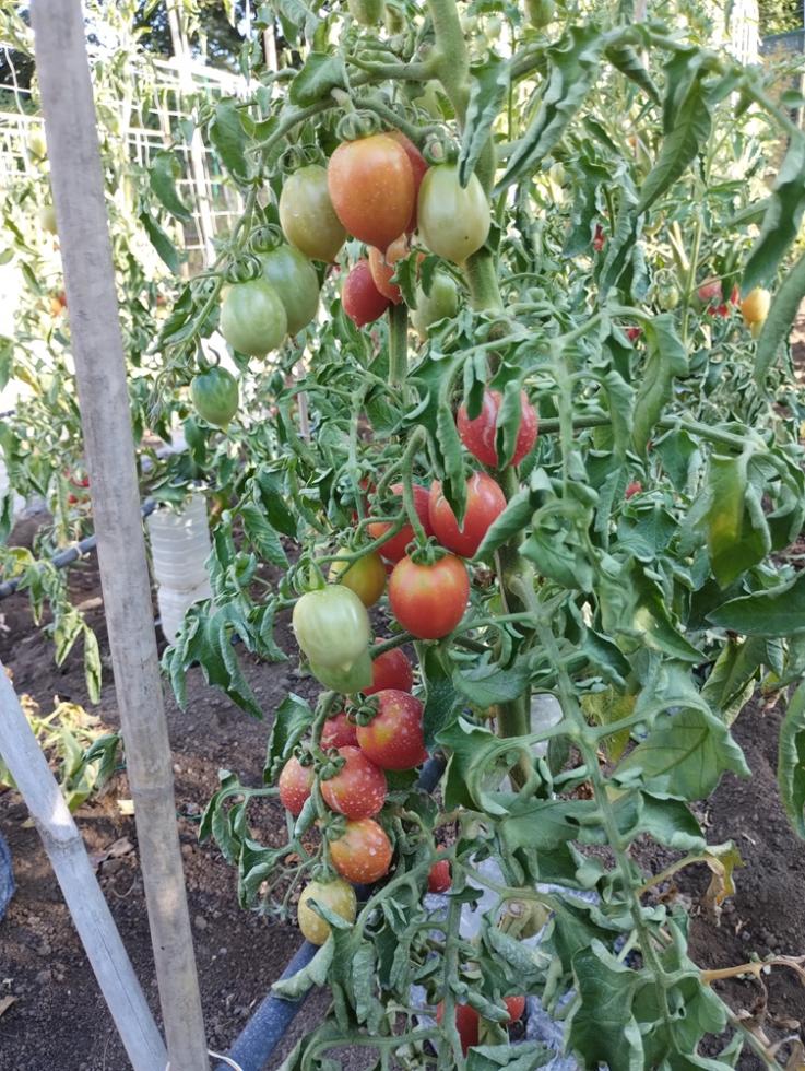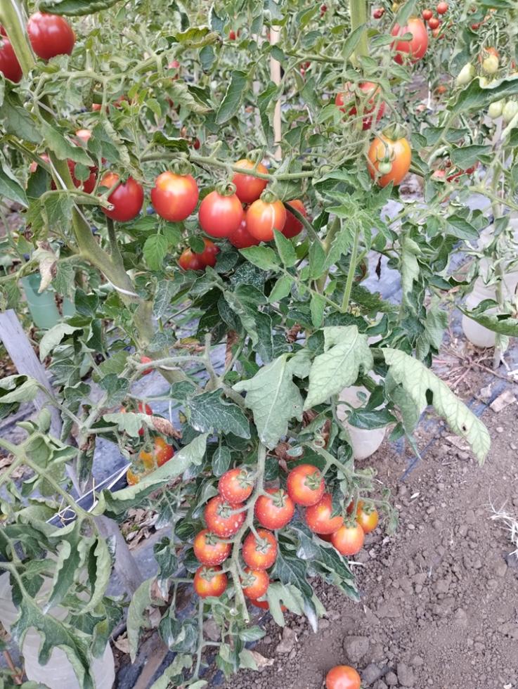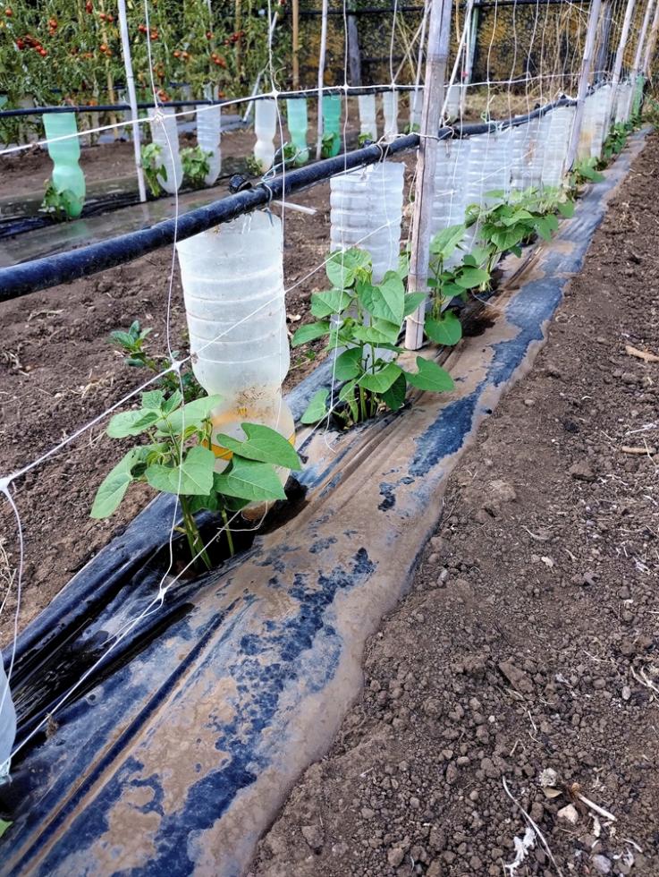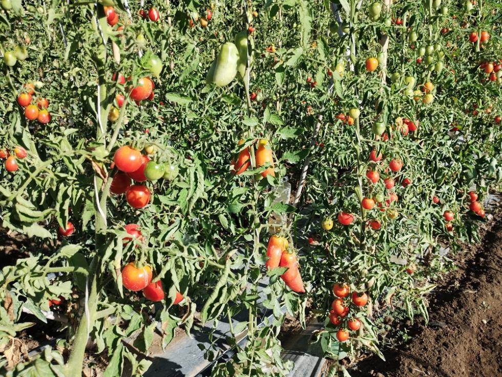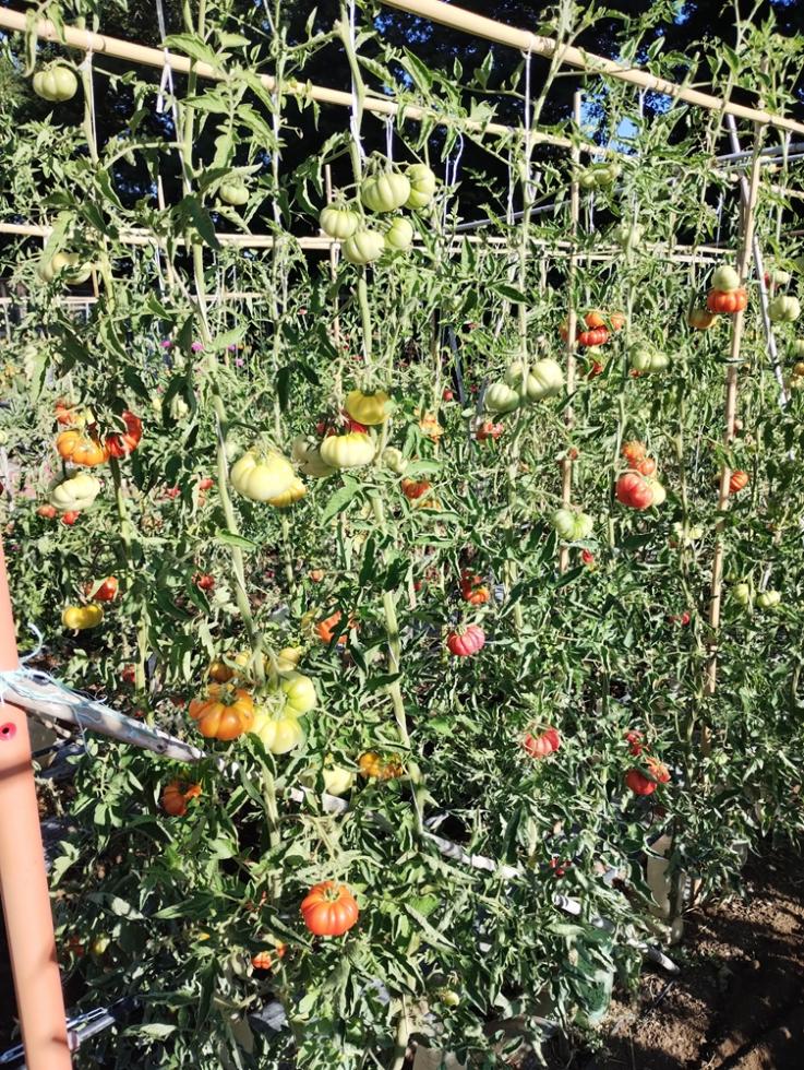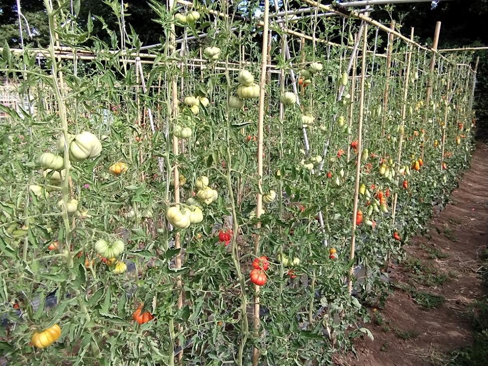 POMODORI, crescita in verticale con struttura in linea di canne bambo e tutori con filo agricolo.