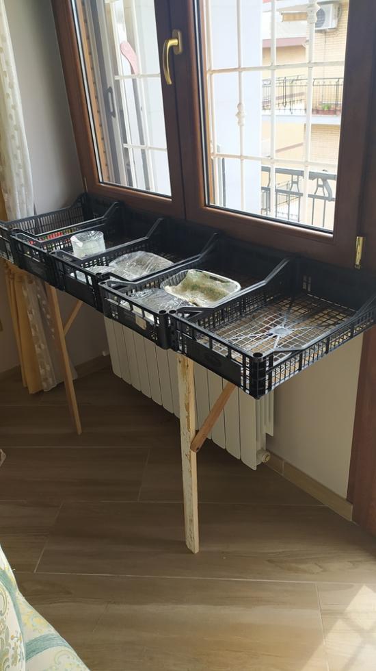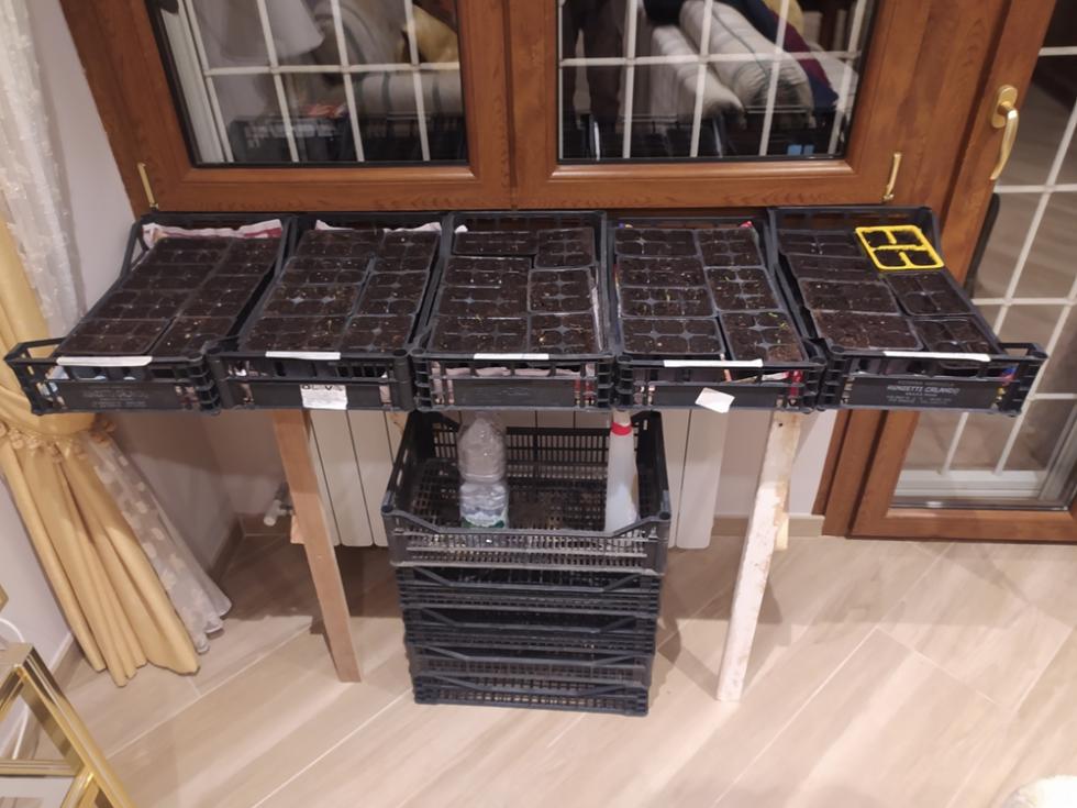 Un saluto a tutti gli appassionati di orto. Tra pochi giorni con l'avvicinarsi della primavera ritornano gli interessi per riavviare le pratiche per riorganizzare la preparazione dell'orto per le nuove colture 2025. In un orto in cui le colture sono molteplici per specie e quantità coltivate, la spesa per l'acquisto di piantine e notevole e quindi meglio organizzarsi fai da te per ottenere piantine da seme che saranno pronte per i trapianti a Aprile/Maggio. Da alcuni anni riesco ad ottenere buoni risultati per la crescita delle piantine di pomodoro mediante l'ottima posizione della mia dimora urbana in quanto sono al 5°/ultimo piano di stabile. La luce è molta e costante per l'intera giornata essendo l'appartamento esposto tutto a Sud. iI calore del termosifone regolato con la valvola termostatica in modo corretto è utilissimo per avviare la germinazione dei semi e poi a seguire il trasferimento in alveoli. La prima germinazione la ottengo mettendo i semi a contatto con strato di feltro-carta impregnato con infuso di camomilla per circa 7-8 giorni. poi trasferisco i semi che iniziano a emettere i primordi di radichette negli alveoli. Un telaio su cui poggiare gli alveoli e necessario e quindi da tempo avevo delle idee pe rendere il tutto pulito e pratico da mettere in casa senza creare scompiglio nell'ambiente, poi il tutto con il rialzo delle temperature a fine Marzo sarà trasferito nella serra che ho nell'orto in zona campagna.