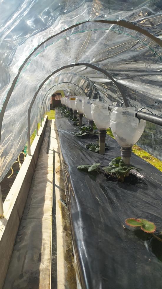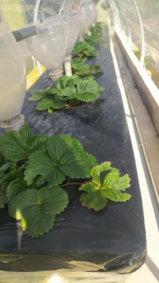 le fragole hanno svernato, adesso speriamo nelle temperature in aumento ma sempre pronti a proteggerle con TNT in caso di bisogno. tutto il binario posto a circa 70 cm dal suolo, meglio così non si stanca la schiena a star piegati in giù e risultato meno formiche.