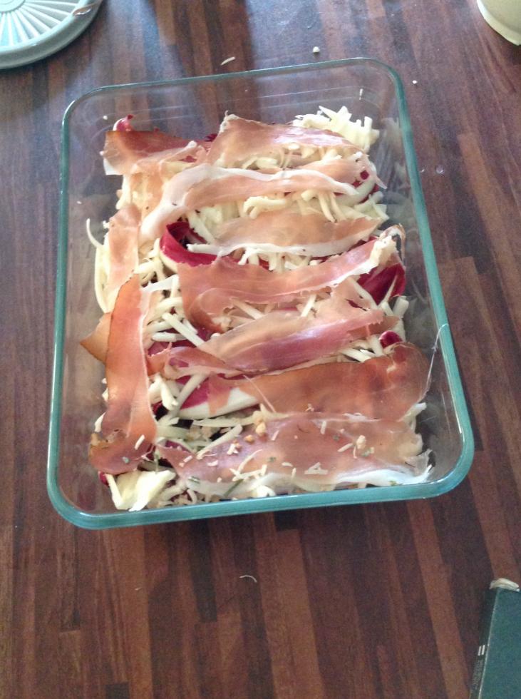 Qui i radicchi sono stati tagliati in piccole parti a coprire la pirofila, grattata di scamorza affumicata e speck in copertura.