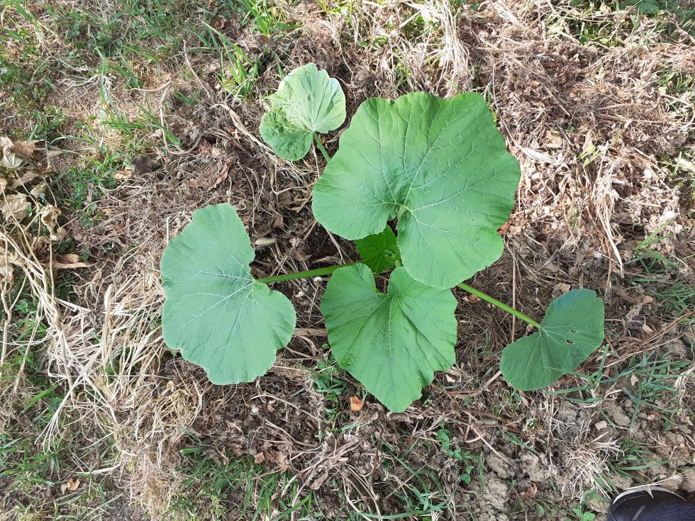 In un vaso di rosmarino che avevo rinvasato è nata questa piantina, la settimana scorsa l ho trapiantata. Sapreste dirmi di che cucurbitacea si tratta ?