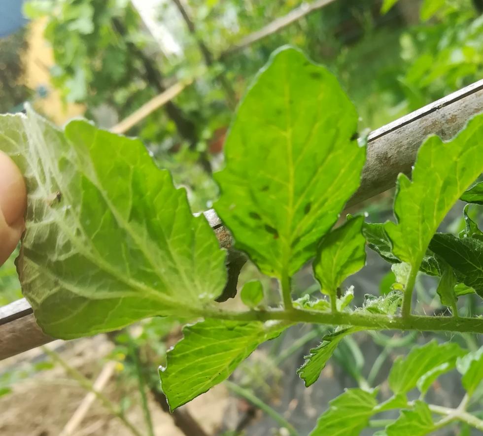 Ad ogni modo, ho fatto la foto sotto le foglie e c è qualche afido. Se può essere utile non distanti da pomodori avevo dei cavoli neri che ho elimnato in quanto pieni zeppi di uova bianche piccolissime sotto le foglie.