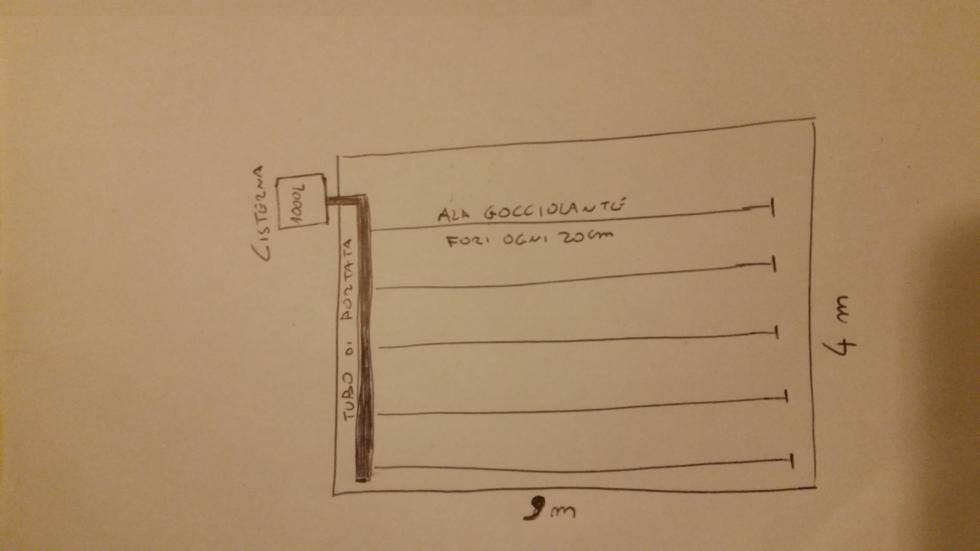 ESILAC10 ha scritto:Questo è il mio piccolo impianto di irrigazione a goccia, con ali gocciolanti forate ogni 20cm, il terreno (9mx4m) è coperto da un telo per paccimatura. La mia domanda è: Quanti litri mandare giù giornalmente? Meglio irrigare tutti i giorni o a cicli? Perche vedo le mie piante di pomodori un po arricciate e non troppo vigorose, non capisco se il motivo è la troppa acqua o troppo poca!