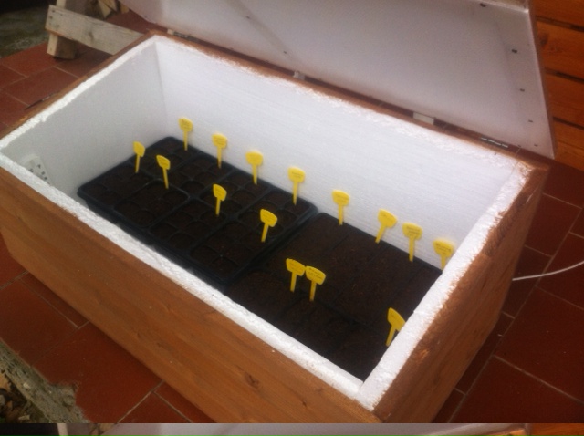 Questo è il semenzaio che mi sono costruito. Il box è di legno e isolato con lastre di polistirolo da 4 cm su tutti i lati. La lastra non sono sicuro sia policarbonato, molto probabilemnte no, dato il prezzo.. Forse è poliespanso o qualcosa del genere. E' riscaldato da un cavetto da 25 watt sul fondo sopra cui ho messo un'altro foglio di polistirolo da 1 cm.