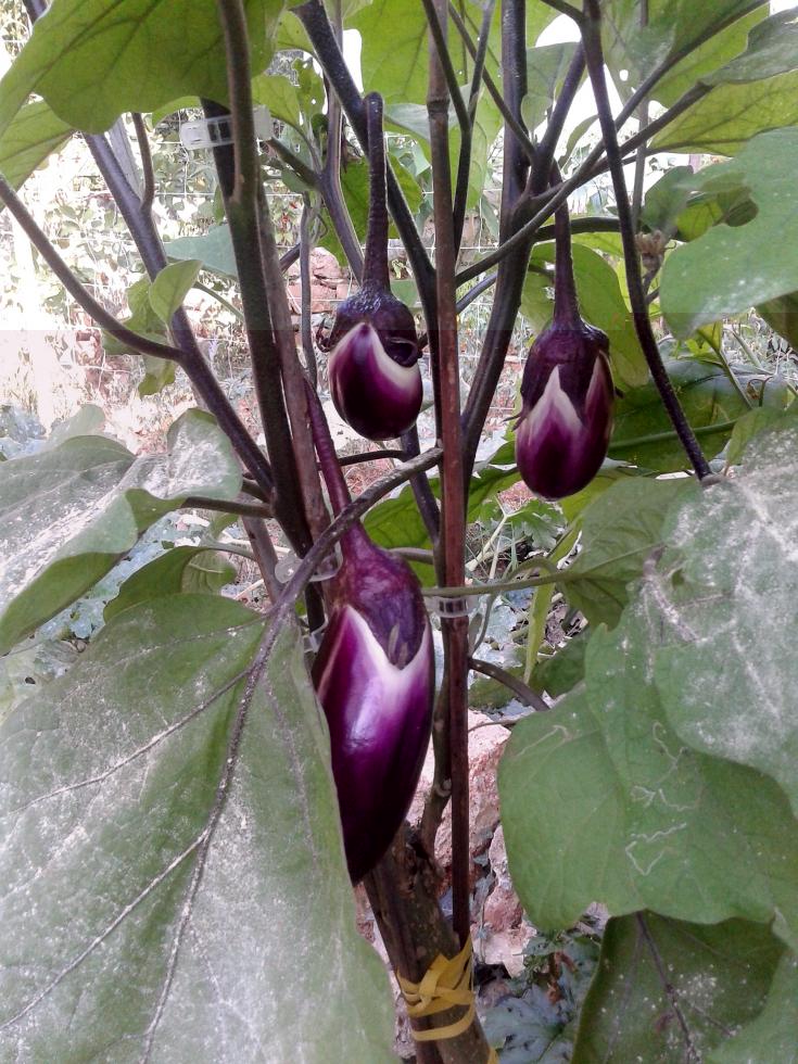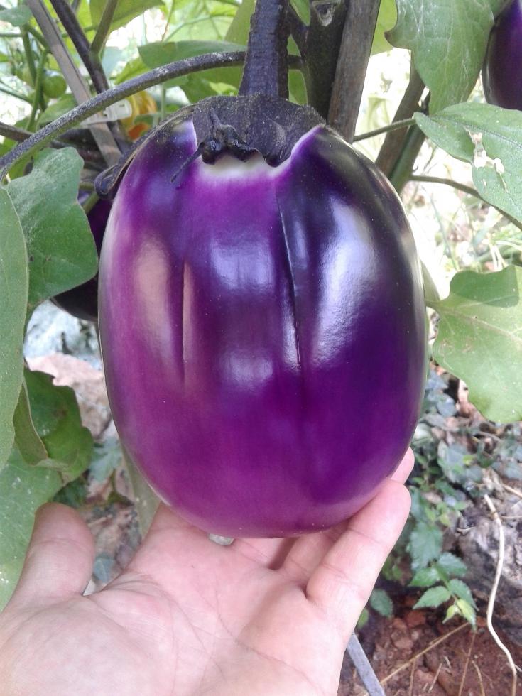La seconda pianta innestata a fine luglio...Ho effettuato nella triforcazione tre innesti per tronco varietà di melanzana: tre violette tonde, tre melanzane rosse, e tre melanzane seta. 1) Gli innesti a corona si sono sviluppati molto meglio con una buona vigoria, prima produzione abbastanza buona con melanzane esteticamente molto belle. 2) Le melanzane hanno raggiunto una buona dimensione da 500 grammi per le seta e 600 a 900 grammi per le violette tonde, tempi di accrescimento 20-25 giorni 3) Una volta raccolte le melanzane sono risultate abbastanza ricche di semi 4) dopo la raccolta anche in questa pianta le prime comparse dei problemi  Ingiallimento foglie, peduncolo delle melanzane con disseccamento piu spaccature del frutto a ridosso del calice.