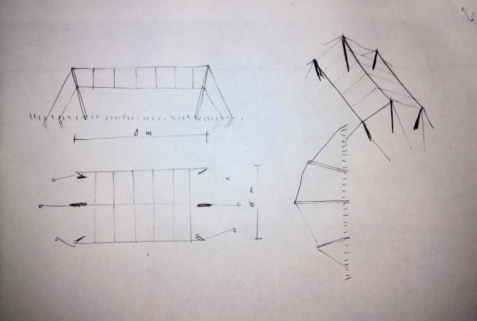 Un'altra miglioria che vorrei apportare all'orto è la copertura dell'intera superficie, circa 6x8,5 m, con telo antigrandine. Per la struttura ho due ipotesi: la prima è costruire una sagoma 'a casetta' con tondino edile saldato, a cui appendere e tendere il telo. La seconda ipotesi è creare una struttura in tensione in cui 'colmo' e 'linea di gronda' sono costituiti da tiranti in acciaio sospesi alla giusta altezza da pali in ferro e poi zavorrati a terra (vedi disegno). Trovo che quest'ultima ipotesi, seppur meno pratica per vari motivi, possa essere esteticamente più gradevole; di contro la 'casetta' è stabile e facile da fare.