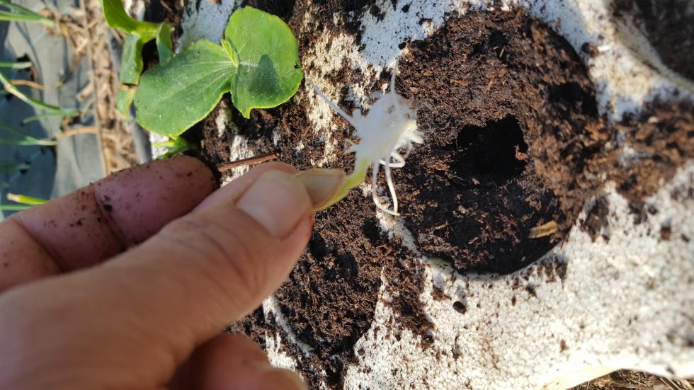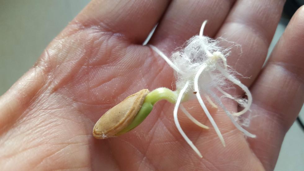 Quando viene fuori la radichetta per almeno un paio di centimetri passo il seme direttamente nel plateau (con alveoli di almeno 8-10 cm di diametro). Nella foto che segue la radichetta ha un pò esagerato :D