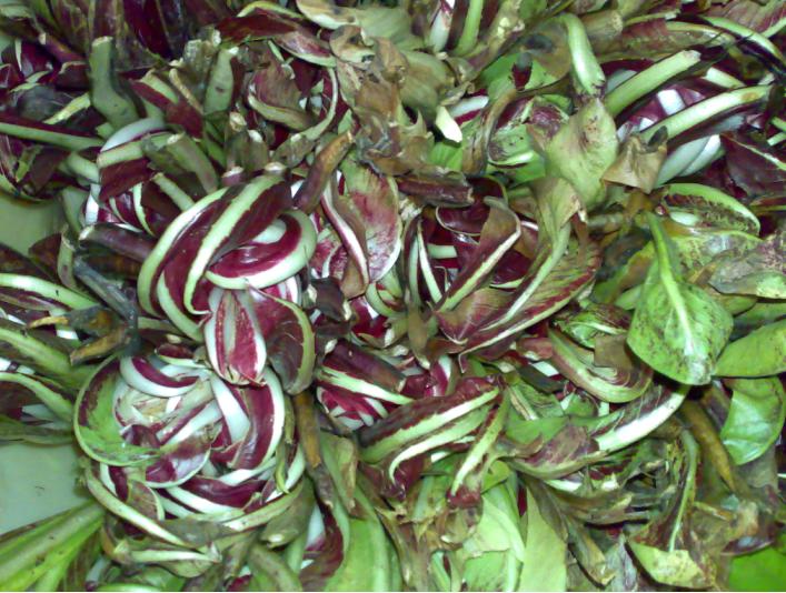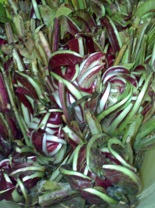 il radicchio rosso trevigiano tardivo, anche se danneggiato dalla grandinata , sta spingendo i germogli che dovrebbero essere pronti per natale ... all'interno delle ceste per l'imbianchimento ...