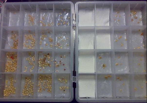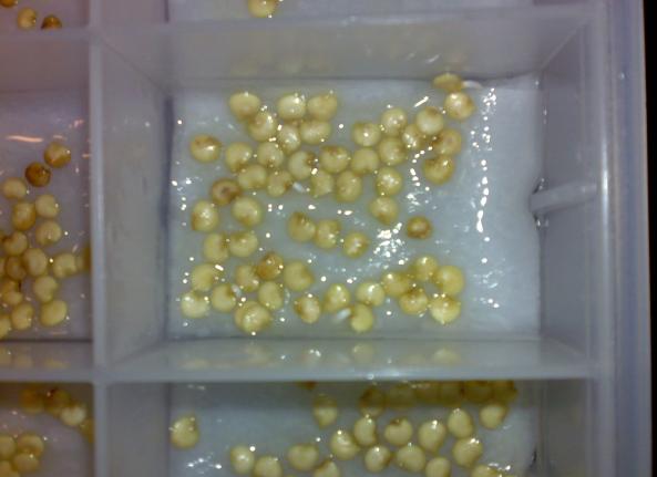 nella semina (con le pinze) immergo le radici nelle micorrize sporcando anche il seme e pianto in celle alveolari nere(quelle acquistate l'anno precedente) il tutto sistemato all'interno di quelle cassette per la frutta alte 10/15cm x cm41 x 61cm rivestite con carta da giornale e nylon per fare in modo che l'acqua che esce rimanga all'interno e venga assorbita dalle celle .