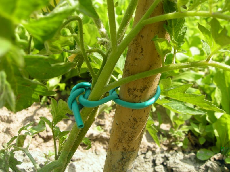 per legarli uso del tubino di plastica verde un po grosso è elastico ma robusto e non ferisce il fusto. fra tutti mi sembra il materiale migliore e che daneggia poco la pianta. qiuando smonto l'impianto recupero quelli messi meglio.. e se qualcuno rimane nella terra ... Allegato: