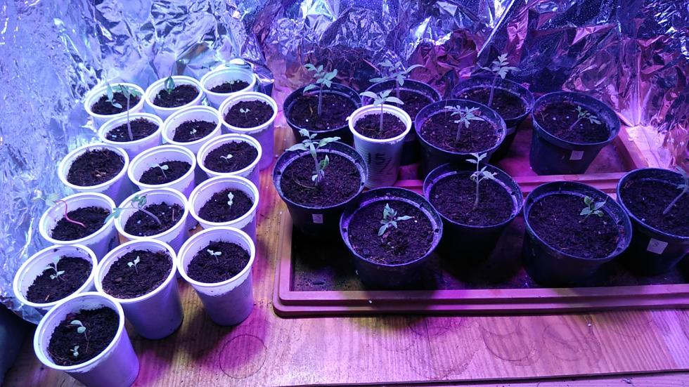 I trapianti sono stati seminati in terriccio commerciale, tenuti al caldo (18 -20 gradi costanti) e una volta nata la piantina, il vasetto spostato in una zona un pochino più fredda ma illuminata da una lampadina bianca e una più "violacea", con una alternanza di luce e buio di 12 ore ciascuno.