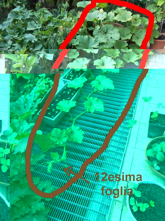 Buongiorno, premetto che è la prima volta che coltivo le zucche, ne ho due tipi: una pianta di "delica" e mi sta dando buone soddisfazioni, ho un frutto (sulla 4' foglia) della dimensione di un pompelmo maturo ed ogni giorno guadagna centimetri di diametro ma il problema sta nella zucca piacentina in quanto ho sentito che andrebbero cimate oltre la 5' foglia e fare lo stesso per i getti laterali che si verranno a creare, il fatto è che nonostante sia ben sviluppata a livello vegetativo (12 snodi fogliari per quasi 3 metri di lunghezza), ha prodotto una valanga di fiori maschi (che rimangono aperti 2-3 giorni poi appassiscono) e nessuna zucca, nemmeno piccole ingiallite come quando capita alle zucchine che non vengono impollinate, la mia domanda è se devo cimare lo stesso pur non vedendo ancora alcun frutto e attendere i nuovi getti o lasciare andare tutto fino a quando non vedo una zucca e da lì cimare dopo 2-3 foglie dalla stessa. Spero mi possiate dire che è normale avere questa situazione nei primi due mesi e che le femmine arrivano sempre dopo questo esercito di maschi. Ho concimato a fine inverno tutto l'orticello con stallatico in pellet nelle dosi consigliate e infatti tutte le varie piante mi stanno fruttificando benissimo, il terreno è ben drenato e fresco, annaffiature regolari, non ci sono parassiti, fogliame in ottima salute, il sole lo ha dalle 11 alle 17:30 circa. Una precisazione, dalla foto vedrete che la zucca corre su una grata, di solito la sfrutto per piante striscianti come cetrioli, zucchine, meloni, angurie ed è sempre andata benissimo evitando il marciume ed altre patologie che possono verificarsi con le foglie a contatto diretto con la terra, non penso possa influire negativamente sulla nascita delle piacentine, che dite? Grazie per i consigli che mi darete