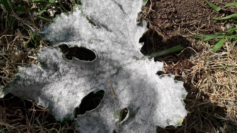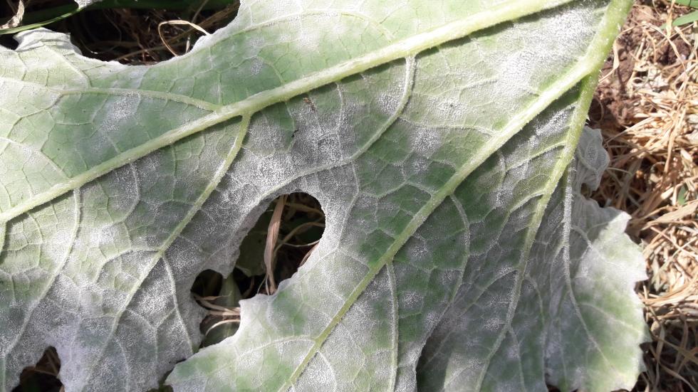 Questo è oidio, un patogeno fungino tipico di questo perdiodo dell'anno, compare prima sulle foglie vecchie e meno sulle nuove, di solito le piante riescono a sopravvivere all'infestazione ma per continuare ad avere una buona produzione si dovrebbe trattare con zolfo alla comparsa dei sintomi. Inizia tagliando alla base le foglie come quella in foto che sono troppo colpite dal patogeno e poi appunto puoi trattare le altre con zolfo bagnabile che dovresti riuscire a reperire nelle agrarie (immagino ci siano anche prodotti più specifici ma costosi)