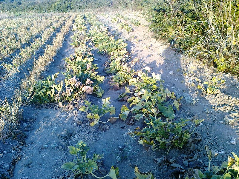 vi mostro le foto delle mie zucchine che da quando le ho piantate non hanno mai visto acqua,e visto la siccità che ci attanaglia non sanno manco cosa sia la rugiada della notte.il terreno è calcareo,ben sciolto e se lavorato in tempera giusta conserva un pò di umidità. le lavorazioni che faccio sono sopratutto dei rincalzi di terra "fresca"con la zappa,niente cure,solo un pò di concime al momento della semina(faccio direttamente la semina in terra e poi dirado)