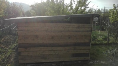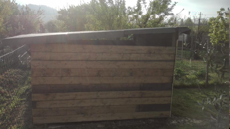 ecco la stalla che ho fatto, due metri e mezzo x due, in perlinato, sotto ho coperto con cemento con pendenza, poi devo ancora mettere quelle mattonelle di plastica da giardino per rialzarle da terra, poi metterò mangiatoia e paglia in terra