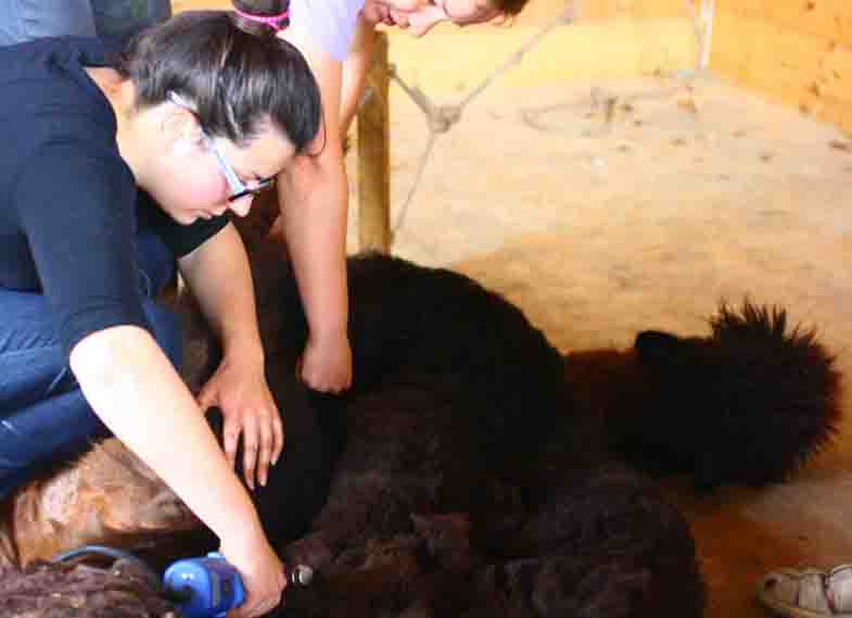 Gli animali sono adorabili e vengono legati senza fatica e fatti scivolare fino ad essere stesi a terra, questo metodo delicato permette di tosare anche alpaca gravide oltre gli ultimi tre mesi di gravidanza, ed è chiamato il metodo australiano.