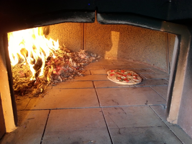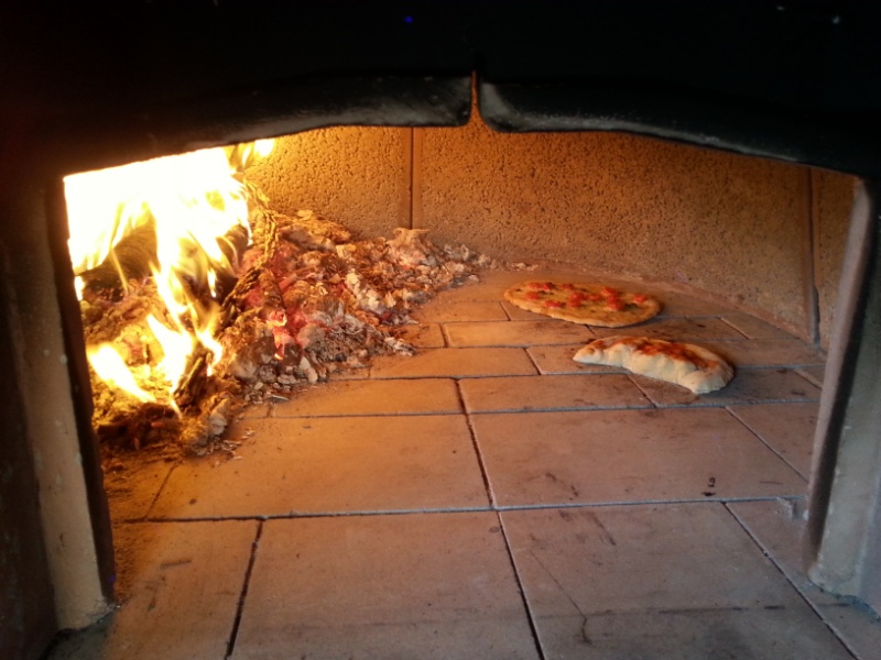 io ho un forno a legna in casa più o meno delle stesse dimensioni di quello delle foto. Uso una tecnica leggermente diversa: a noi in famiglia piacciono le pizze basse (scusate amici napoletani  ) per evitare che con il pomodoro si attacchino al fondo del forno metto in cottura di pochi secondi le basi senza niente in modo che diventino abbastanza solide. Dopodiché ci metto il pomodoro ed il condimento e le rimetto in forno.
