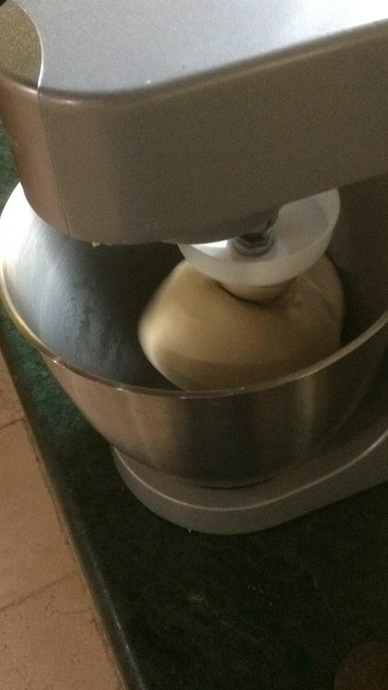 Siamo al mattino seguente con la nostra ciotola bella rigonfia, mettiamo in fila il resto degli ingredienti e prepariamo la planetaria per impastare. Metto per primo l'impasto lievitato, circa 850 gr. poi aggiungo 250 gr. d'acqua e accendo la planetaria al minimo , aggiungo un cucchiaino di malto d'orzo e 3/4 della farina , circa 600 gr. poi metto i 100 gr. di strutto che ho provveduto ad ammorbidire con un qualche secondo nel microonde. faccio amalgamare par qualche minuto questi ingredienti e poi aggiungo i 2,5 cucchiaini di sale e la farina restante 200 gr. impasto il tutto per circa 30 minuti