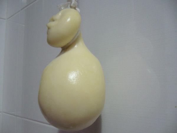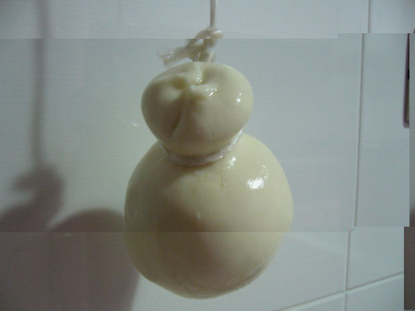 La forma si è "ammaccata" perchè il contenitore con l'acqua fredda era troppo piccolo, mene sono accorta troppo tardi e il cacicavallo non galleggiava, quindi appoggiandosi a preso questa forma.
