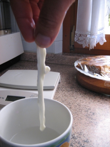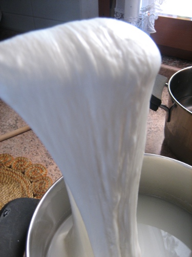 primo esperimento mozzarella 20/08/2012 3,7lt di latte crudo prelevato al distributore (mungitura del giorno precedente) temperatura ambiente ore 8.00: 22°C ore 8.00 portato il latte a 37,5 °C (pH 6,7) ore 8.15 aggiunto 150ml yogurt naturale fatto in casa ore 8.45 aggiunto 1,4ml caglio (pH 6,3) e riportato a 38°C ore 9.35 primo taglio cagliata a quadrotti ore 9.45 secondo taglio cagliata con frusta a nocciola ore 10.00 tolto il siero e aggiunto pari quantità di acqua a 41°C. acceso il gas per portare tutta la massa a 40 °C ore 11.30 stacco un pezzo di cagliata per la prova empirica. Non fila. Misuro il pH della cagliata (5,3) e la temperatura (39,8°C). Rimetto il coperchio. - preparato acqua di filatura: 2lt e 2 cucchiai di sale grosso (circa 30gr). ore 12.10 prova filatura buona (tirando le estremità il filo si rompe dopo circa 35 cm). Allegato: