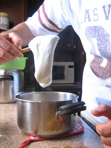 aspettavi ancora una mezz'oretta a filarle era meglio... noti che è ancora ruvida? per il resto, la procedura la conosci.. Vai avanti così che puoi migliorare. Quando sono sicuro che la cagliata va bene, aspetto ancora 10 minuti prima di iniziare le fasi di filatura