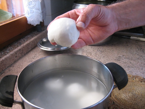 ore 12.55 sono riuscito ad ottenere 5 bocconcini ma l'operazione di formatura dei bocconcini richiede necessariamente maggiore esperienza. La pasta risultava resistente alla mozzatura manuale e la forma sferica è rimasta un miraggio. Totale mozzarelle realizzate 410gr con 3,7 lt di latte crudo. Allegato: