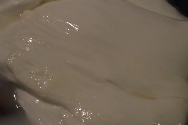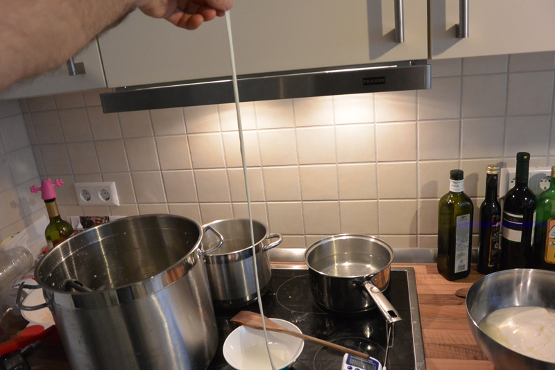 Per la prima volta un pezzettino di cagliata durante la prova si è allungato a gravità e per tutta la lunghezza del braccio (la prossima volta salgo su una sedia per vedere se arriva a terra :lol: ).