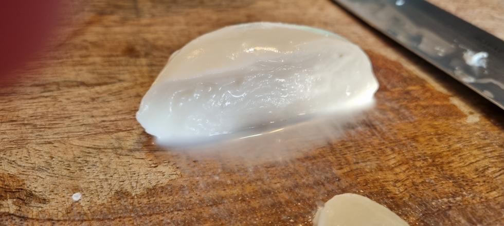 Avevo iniziato a fare dei tentativi con la procedura di acidificazione acellerata con acido citrico, e le mozzarelle erano venute buone, ma durette / gommose (come se fosse mozzarella per pizza)... Forse perché ho sminuzzato troppo la cagliata prima della filatura che quindi ha perso troppo siero?