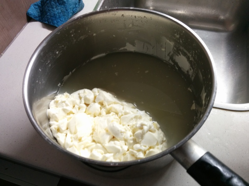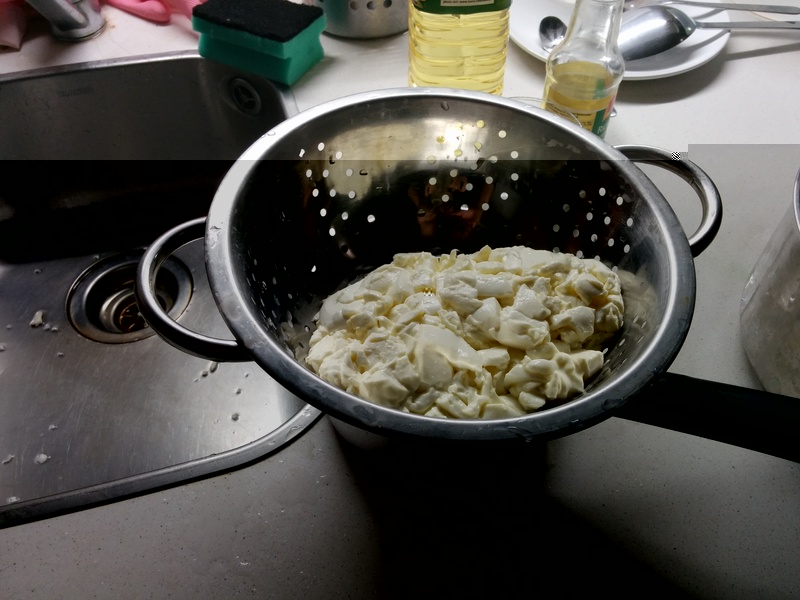Resta quindi un mistero come fare a estrarre il siero dopo i 2 tagli visto che molto rimane dentro i mezzi di cagliata e viene pian piano rilasciato nell'acqua in cui avviene la maturazione. Quello che ho fatto io e' togliere la cagliata col cucchiaio e versarla nell'acqua. Ma a quel livello di maturazione (dopo il secondo taglio) e' troppo morbida per essere "strizzata" senza spappolarsi.