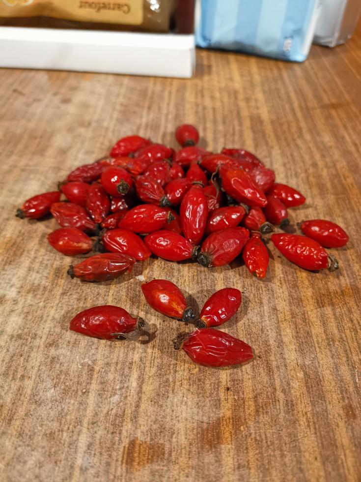 Salve a tutti, ho trovato un po' di cinorrodi su pianta che non sono proprio turgidi e che si staccano piuttosto facilmente. So che i cinorrodi della rosa canina vengono spesso raccolti in autunno per essiccarli per tisane. Quelli che hanno un odore di "macerato" li ho scartati, mentre i rimanenti li ho aperti ed hanno forse più peli del solito e il carpo (rosso) più sottile ma sono buoni al sapore e all'olfatto.
