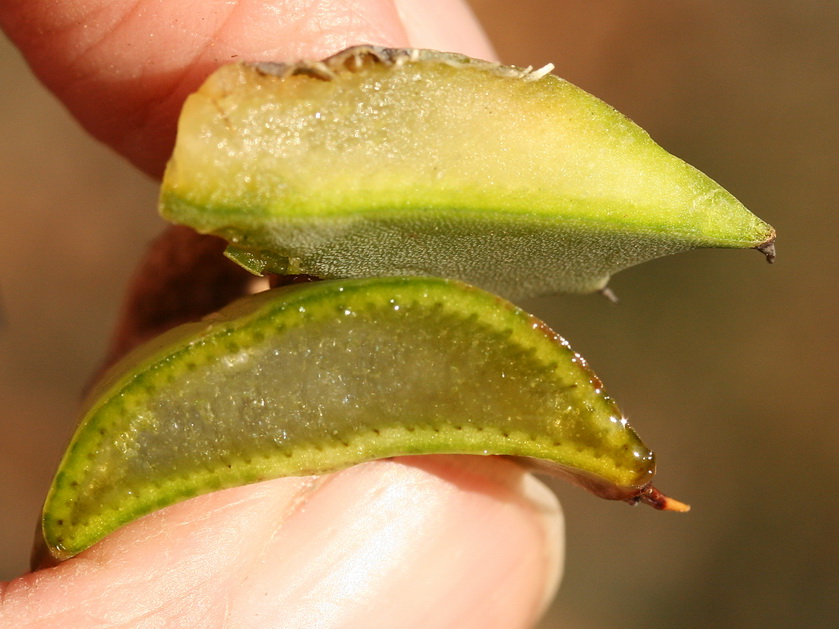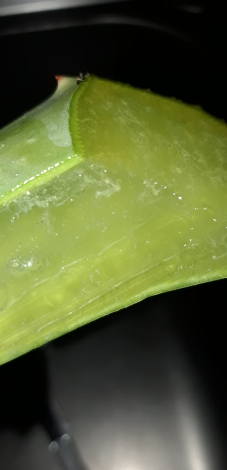 Ecco le foto promesse. La prima è agave, la seconda è aloe (sta fiorendo, si intravvede lo stocco); la terza foglie tagliate (sopra agave, sotto aloe): l'agave appare carnoso-fibrosa e semi-asciutta, mentre l'aloe è più morbida, di aspetto acquoso e rilascia un succo gelatinoso.