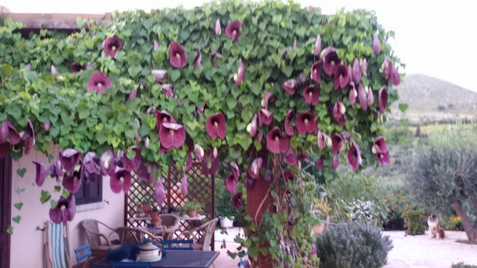 Ecco la mia aristolochia. É difficile da tenere a bada perche cresce velocissima e per mantenere una bella forma si deve potare senza pietá in inverno...peró é molto bella
