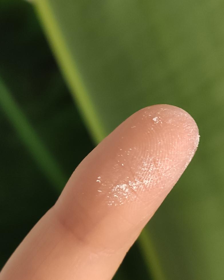 Stasera le ho fatto la solita doccia nella vasca e l'ho lasciata lì ad asciugare come sempre prima di rimetterla nel coprivaso, se non fosse che quando sono tornata dopo un'oretta per controllarla ho notato che in due/tre steli, proprio vicino al fusto, c'era della polverina bianca mai vista prima. (allego foto).