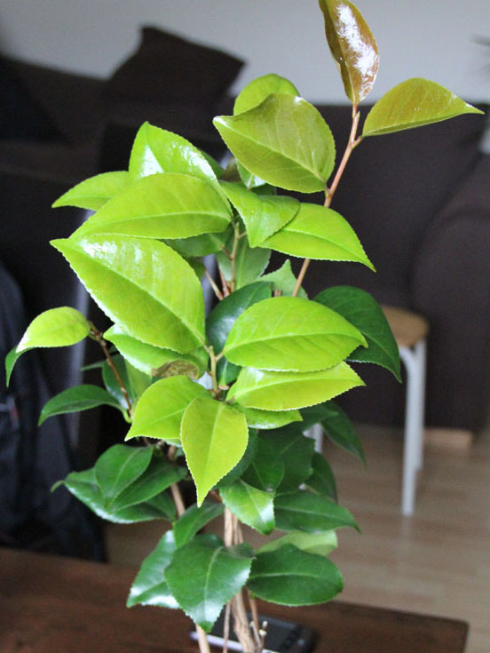 Si deve abituare al sole diretto, anche se come penso tu sai, le camelie non amano il sole, ma sono spesso messe dietro muri o sotto alberi, soprattutto quando hanno il fiore. Nel tuo caso non è data, quanto caratteristica della pianta, ma a causa dei germogli teneri dopo molto tempo di poca esposizione al sole.