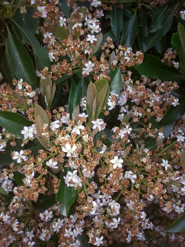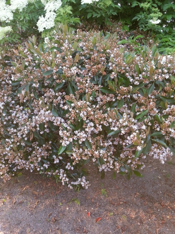Pianta n° 5 - Altro arbusto che produce fiori a grappolo bianchi. Ogni fiore è formato da 4 petali perfettamente rotondi e col passare del tempo cambia colore. Da bianco a rosa, poi viola e infine si secca e diventa marrone restando sulla pianta. (Fiori non in foto, descrivo quelli dell'anno scorso)