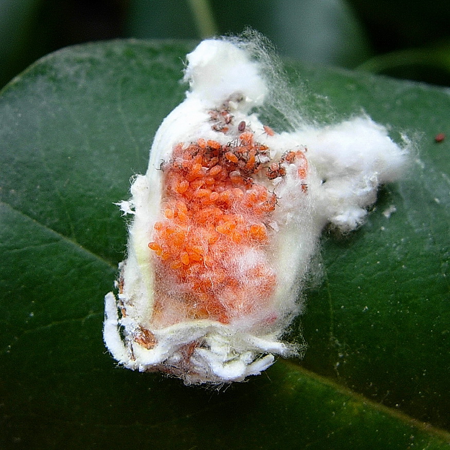 Devo staccarne qualcuna e rovesciarla. La cosa bianca solcata è l'ovisacco ceroso che protegge le uova di color arancio vivo; le forme giovanili sono piccole, di color rossastro con zampe scure e sono mobili. E' una specie ermafrodita, dunque si autofeconda; le uova non fecondate diventano individui aploidi maschili (molto rari). Il trasporto a distanza si realizza col vento che disperde neanidi. Ti allego un paio di mie foto