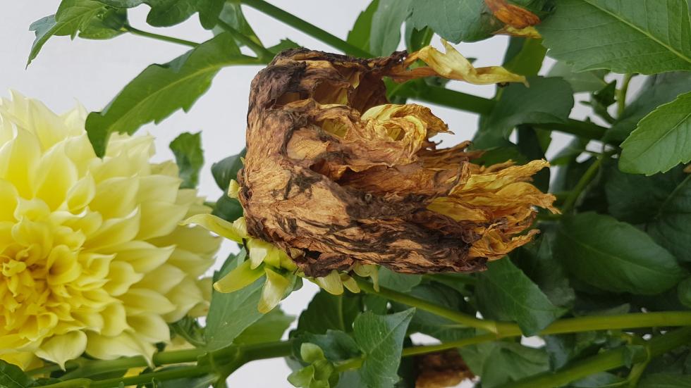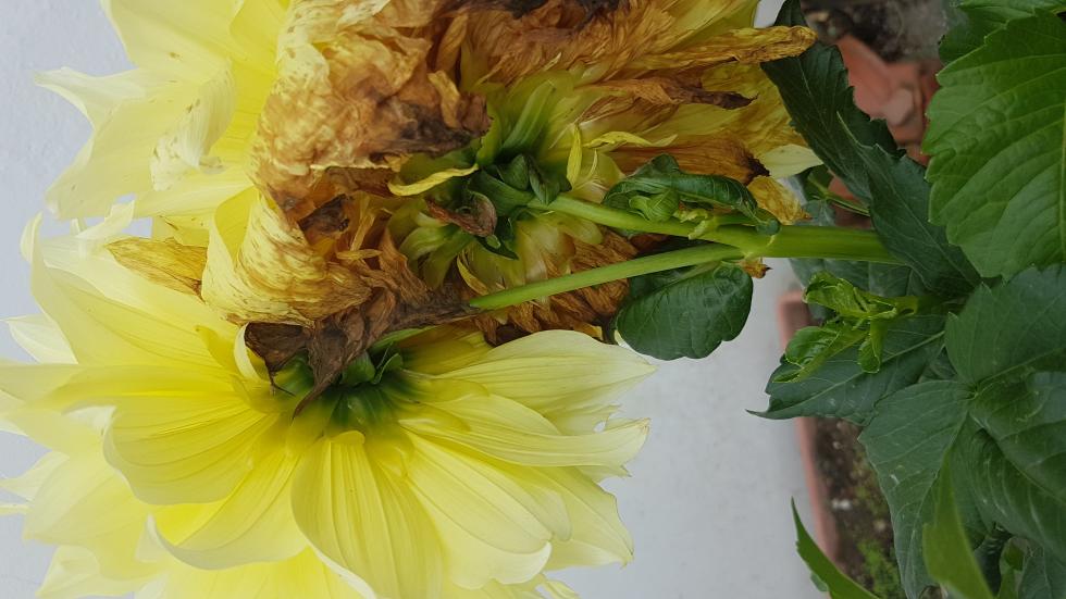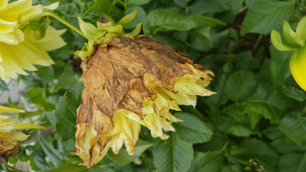 dalie con fiori e boccioli che marciscono