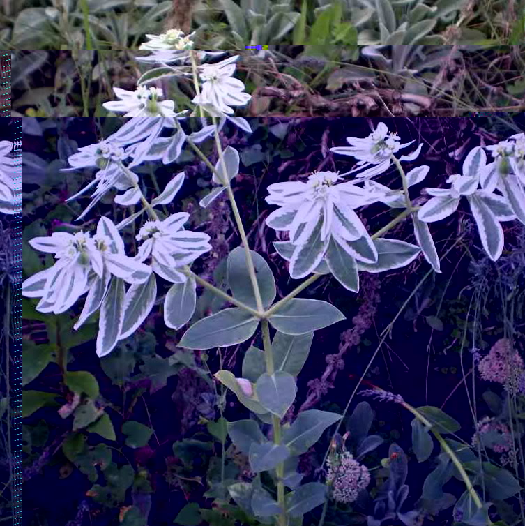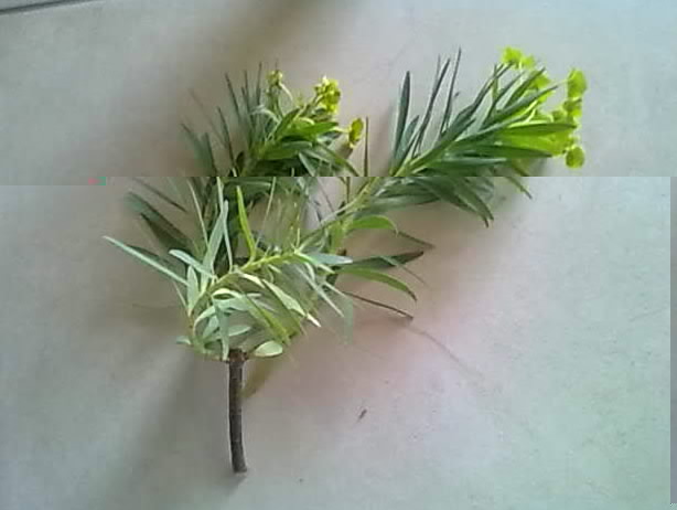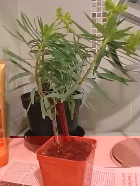 Novità!Le talee in acqua si sono autoimpollinate.Ho notato questa cosa singolare,i pistilli una volta maturi hanno "sparato" lontano il polline,l'ho trovato anche a 20 cm di distanza,e i baccelli si ingrossano ogni giorno di più.Sarebbe bellissimo veder maturare i semi,anche se le speranze sono poche,trattandosi di talee.. La prima,quella interrata,si sta già disidratando,sicuramente non beve l'acqua che le dò,vedrò cosa farne,se continuare ancora un po' così,o farla reidratare in acqua e provare a farla radicare in pomice,come si fa per le specie succulente. A breve seminerò un'altra euphorbia da giardino,la marginata,che produce bellissimi e durevoli fiori recisi in estate,e mi è sempre piaciuta perché pianta vecchia e povera,dei giardini contadini di una volta. Eccone una piantina giovane: