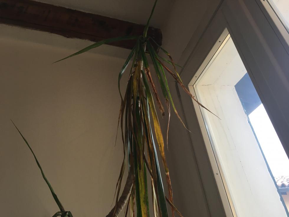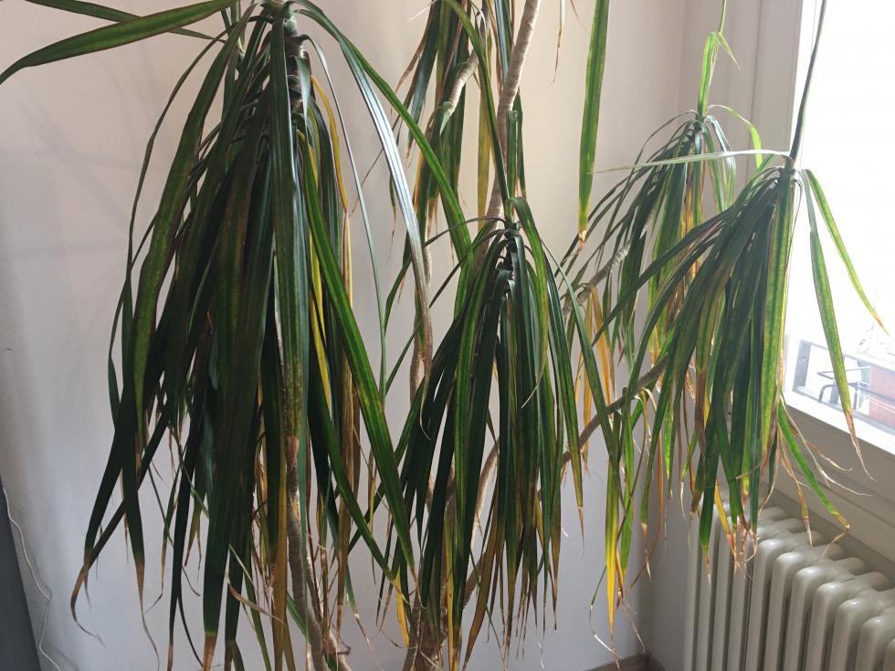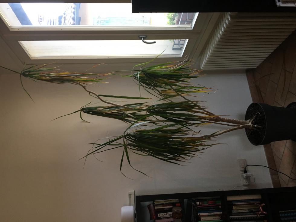 si tratta di una dracena marginata, pianta adulta, ormai di 6-7 anni circa, altissima (praticamente 2 metri) che è sempre stata benissimo che però dall'autunno scorso aveva iniziato a fare le classiche punte marroni e a non stare benissimo (si trova vicino a un calorifero, forse il fatto che abbiamo lavorato in casa, cosa che ci ha fatto usare molto di più il riscaldamento, probabilmente ha influenzato): abbiamo deciso settimana scorsa di travasarla, ma abbiamo peggiorato la situazione, le cime si sono completamente afflosciate, in modo bruttissimo come si vede nelle foto, le punte marroni sono aumentate in moltissime foglie e la pianta al momento non si sta riprendendo
