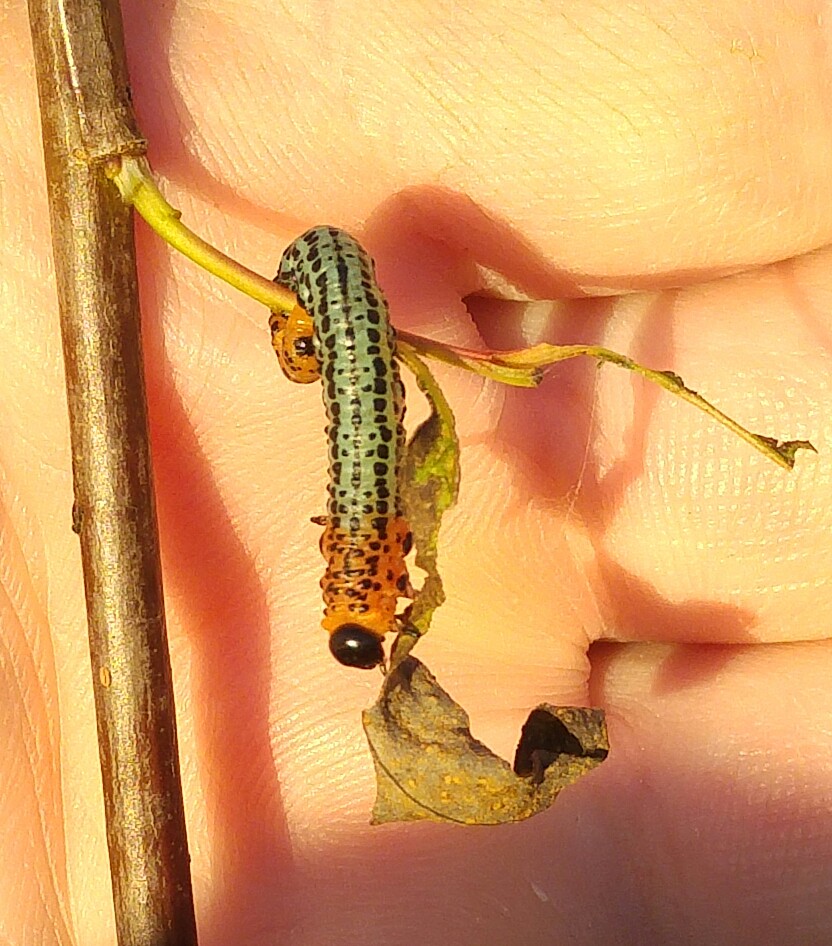 E' quella. Non sono bruchi di lepidotteri ma larve di tentredini (Imenotteri). Il nome scientifico preferito (EPPO) è Nematus salicis; il nome comune in italiano è tentredine del salice. Le larve delle tentredini io le distinguo a prima vista da quelle dei lepidotteri guardando il capo, che è a forma di capocchia di spillo e con due occhietti puntiformi; in realtà la differenza morfologica più importante riguarda comunque il numero delle zampe: ne hanno tre paia toraciche e 7-8 paia di pseudopodi addominali (nei lepidotteri max cinque). In questa specie i tre segmenti toracici e gli ultimi due addominali sono di colore giallo: dalle foto si vede abbastanza bene. Hanno comportamenti e atteggiamenti simili alle tentredini defogliatrici della rosa: ad es. se le stuzzichi assumono una posizione ad arco.