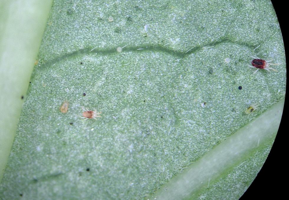 - antagonisti; ci sono varie specie di antagonisti, in particolare acari (il costo ovviamente è superiore al chimico e naturalmente sono organismi vivi e quindi vanno spediti e impiegati con determinate precauzioni); alcuni sono confezinati in bustine semplicemente da appendere, altri bisogna spargerli (metto una mia foto in cui si vedono r.rossi di varia età e colorazione, loro uova e sulla sx in color rosa pallido un acaro fitoseide, predatore dei medesimi)