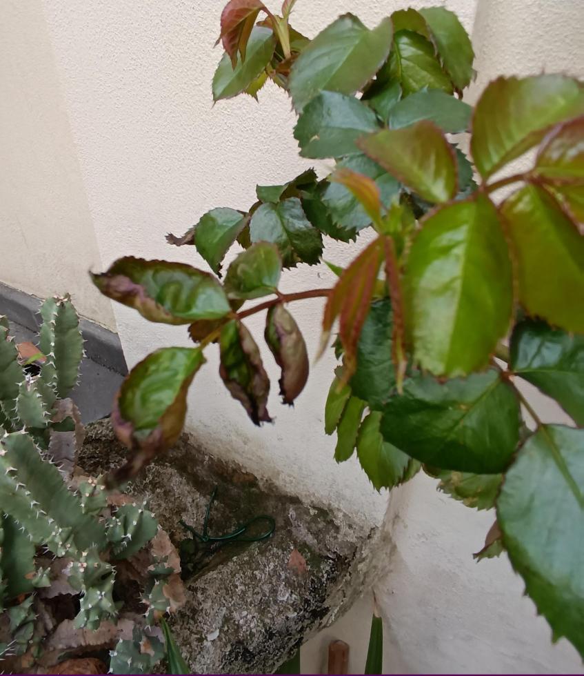 Rosa rampicante, ha messo bene ma alcune foglie hanno il bordo accartocciato e quasi secco